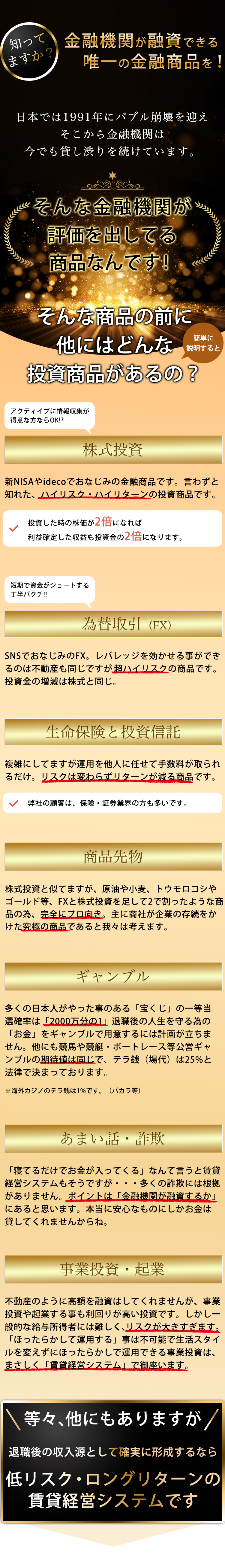 ギャンブルは合わない性格です。担当の方には何度も説明していただき、とても勉強になりました。これだけ良い商品がネットでは悪く書かれていることに陰謀すら感じますね。友人も紹介しようと思いますが、ソリットさんの企業理念も共感できます。頑張って広めてください。