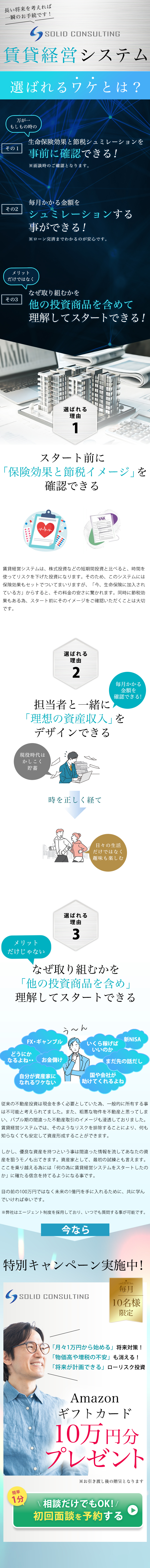 元々不動産投資はしていたのですが、知人からの紹介でソリット社とお付き合いしました。持つ意味を一緒に考えてくれる点や、